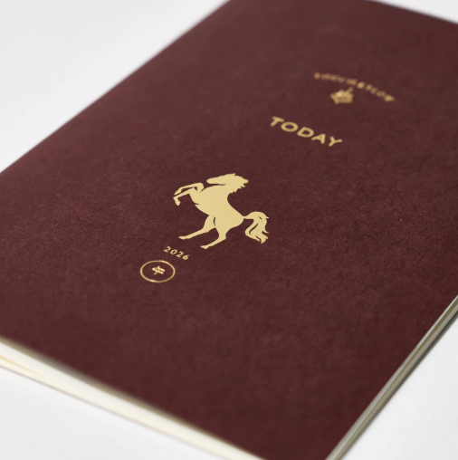 Zodiac edition: Burgundy cover with a foil-stamped horse design representing 2026.
